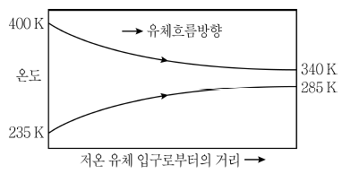 병류의 이중관 열교환기에서 두 흐름의 온도분포가 그림과 같다. 총괄열전달계수는 250로 일정하고 열흐름 속도가 25kW일 때, 이 열교환기의 전열 면적[