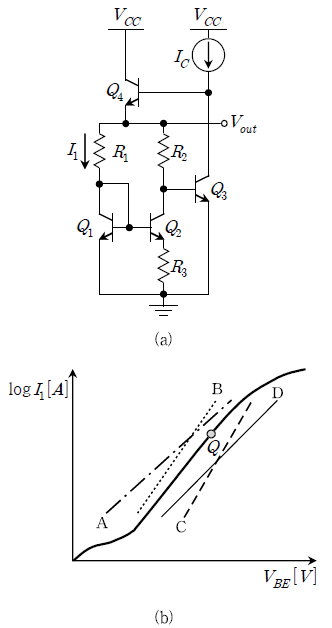 다음 그림 (a)의 밴드갭 레퍼런스 회로에서 BJT 의 전류-전압 곡선은 그림 (b)에 굵은 실선으로 그려져 있으며, 이