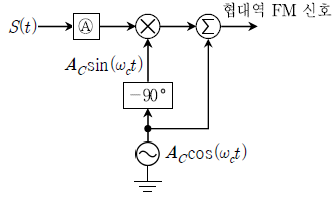 다음 블록도는 신호 를 입력받아 협대역 FM 신호를 출력하는 시스템이다. 블록 Ⓐ의 회로도로 옳은 것은?