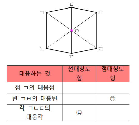 도형은 선분 ㅂㄷ을 대칭축으로 하는 선대칭도형이면서 점 ㅇ을 대칭의 중심으로 하는 점대칭도형입니다. 그림 을 보고 ㉠, ㉡에 알맞은 것을 바르게 나타낸 것은 어느 것입니까?