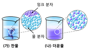 그림과 같이 (가)찬물과 (나)더운물에 각각 잉크를 동시에 떨어뜨렸더니 (나)에서 잉크가 더 빠르게 퍼졌다. 이 실험 결과와 관련이 있는 현상은?