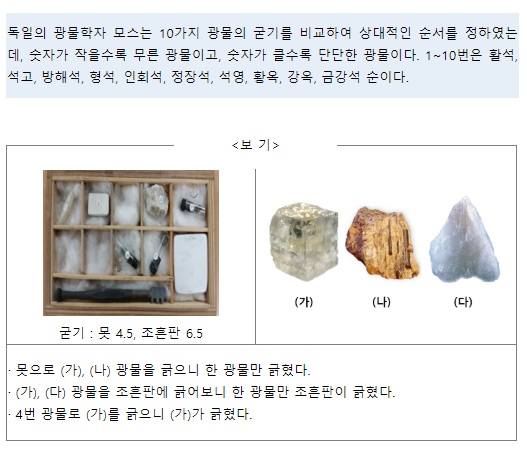 3영수는 과학실에서 뒤죽박죽 된 모스굳기계 표본을 발견했는데 중 3가지 광물에는 번호가 붙어있지 않았다. 번호가 붙어있는 광물은 1번, 2번, 4번, 5번, 8번, 9번, 10번 광물이다.