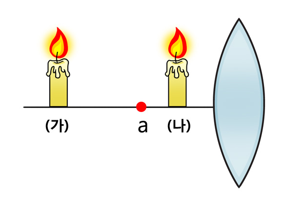 24그림과 같이 볼록렌즈 앞에 (가)와 (나) 각각의 지점에 물체를 놓았을 때 보이는 상의 모습을 바르게 표현한 것은? (단, a지점은 초점을 나타낸다)