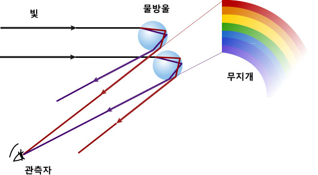 27다음은 공기 중의 물방울에서 빛이 굴절하여 무지개가 보이는 원리를 설명하는 그림이다.