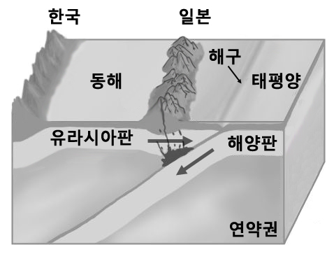 13그림은 우리나라 주변에서 나타나는 판 구조 단면이다.