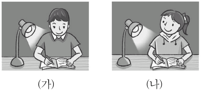 그림 (가)는 전등을 켜고 책을 읽을 때, 그림 (나)는 직접 전등을 볼 때의 모습을 각각 나타낸 것이다.