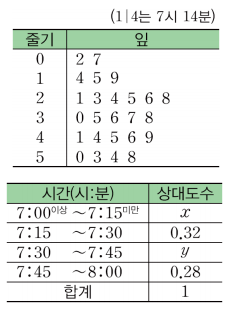다음은 화요일 오전 7 시부터 오전 8 시 전까지 어느 편 의점에 손님이 들어온 시간을 조사하여 나타낸 줄기와 잎 그림과 상대도수의 분포표이다.