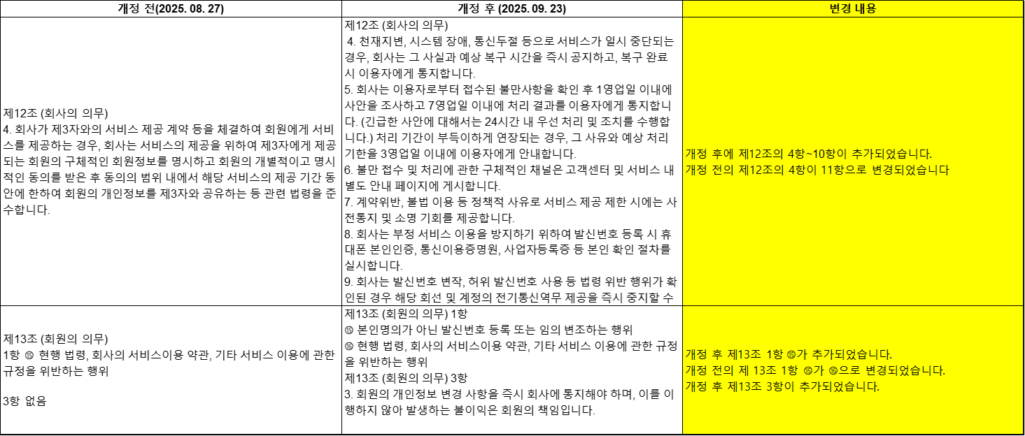 변경사유: 문자 발송 서비스 추가로 인한 이용약관 개정